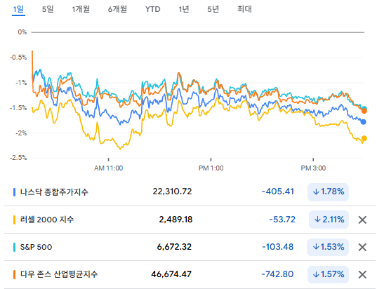 [¹Ì±¹ Áõ½Ã] - Dow 46,677.85(-1.56%) - S&P500 6,672.62(-1.52%) - Nasdaq 22,311.98(-1.78%) - Russell2000 2,488.99(-2.12%)