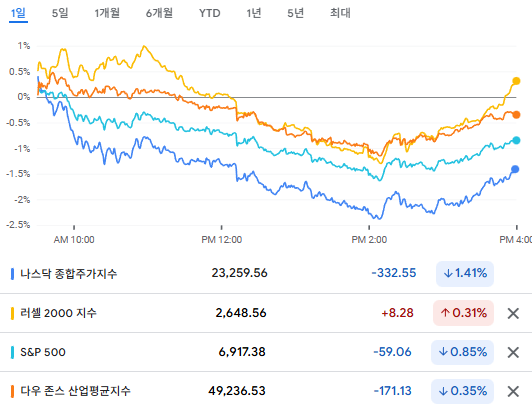 [¹Ì±¹ Áõ½Ã] - Dow 49,240.99(-0.34%) - S&P500 6,917.81(-0.84%) - Nasdaq 23,255.19(-1.43%) - Russell2000 2,644.63(+0.16%)