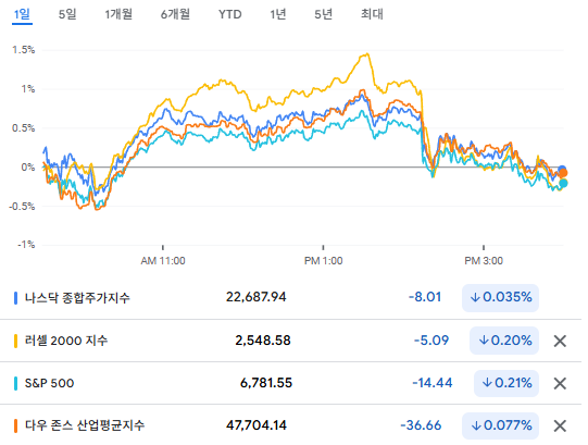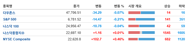 [¹Ì±¹ Áõ½Ã] - Dow 47,706.51(-0.07%) - S&P500 6,781.48(-0.21%) - Nasdaq 22,697.10(+0.01%) - Russell2000 2,545.69(-0.31%) - Çʶóµ¨ÇÇ¾Æ ¹ÝµµÃ¼ 7,865.12(+0.70%) - Nasdaq Biotechnology 5,944.53(+0.74%) - VIX 25.68(+0.71%)