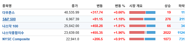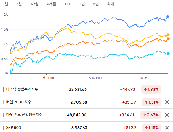 <ÁÖ¿ä Áö¼ö Á¾ÇÕ> - Dow 48,535.99(+0.66%) - S&P500 6,967.38(+1.18%) - Nasdaq 23,639.08(+1.96%) - Russell2000 2,704.56(+1.28%)