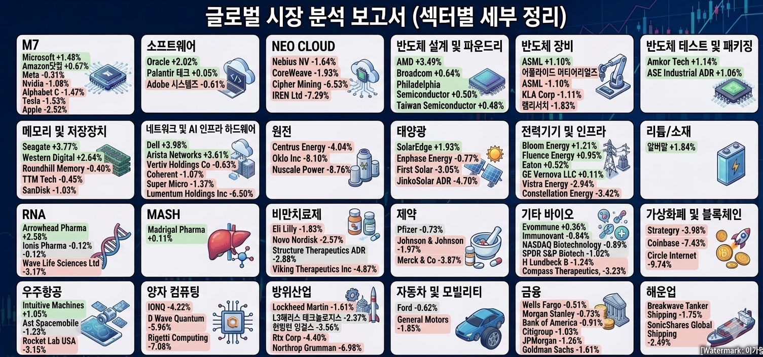 [¹ÝµµÃ¼] [¼³°è ¹× ÆÄ¿îµå¸®] AMD (+3.49%), ºê·ÎµåÄÄ (+0.64%), Çʶóµ¨ÇÇ¾Æ ¹ÝµµÃ¼ (+0.50%), Taiwan Semiconductor (+0.48%) [Àåºñ] ¾îÇöóÀÌµå ¸ÓÆ¼¾î¸®¾óÁî (+0.70%), ASML (-1.10%), KLA Corp (-1.11%), ·¥¸®¼Ä¡ (-1.83%) [Å×½ºÆ® ¹× ÆÐŰ¡] Amkor Tech (+1.14%), ASE Industrial ADR (+1.06%) [¸Þ¸ð¸® ¹× ÀúÀåÀåÄ¡] ¾¾°ÔÀÌÆ® (+3.77%), ¿þ½ºÅÏ µðÁöÅÐ (+2.64%), ¸¶ÀÌÅ©·Ð(+0.21%), Roundhill Memory (-0.40%), TTM Tech (-0.45%), »÷µð½ºÅ© (-1.03%) [³×Æ®¿öÅ© ¹× AI ÀÎÇÁ¶ó Çϵå¿þ¾î] µ¨ (+3.98%), ¾Æ¸®½ºÅ¸ ³×Æ®¿÷½º (+3.61%), Vertiv Holdings Co (-0.63%), Coherent (-1.07%), Super Micro (-1.37%), Lumentum Holdings Inc (-6.50%) [³×¿ÀŬ¶ó¿ìµå] Nebius NV (-1.64%), CoreWeave (-1.93%), Cipher Mining (-6.53%), IREN Ltd (-7.29%)