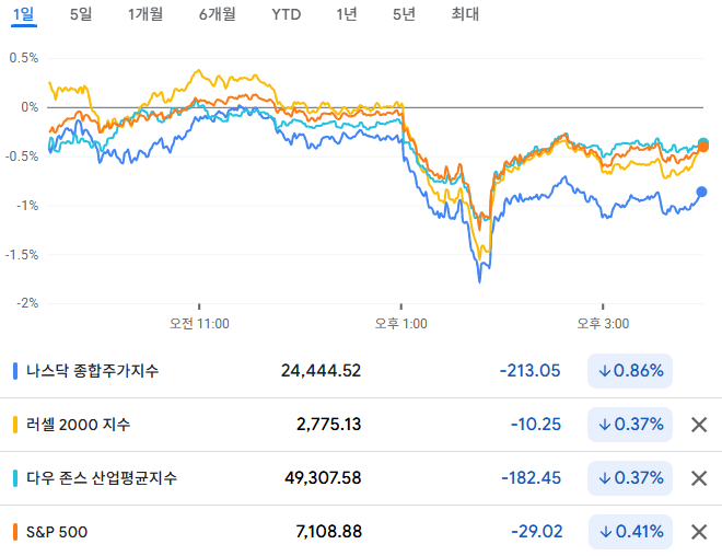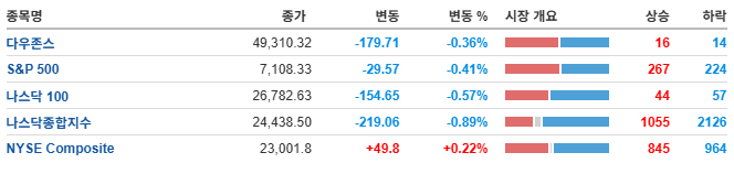 👉 - Dow 49,310.32(-0.36%) - S&P500 7,108.40(-0.41%) - Nasdaq 24,438.50(-0.89%) - Russell2000 2,775.10(-0.37%) - Çʶóµ¨ÇÇ¾Æ ¹ÝµµÃ¼ 10,078.57(+1.71%) - Nasdaq Biotechnology 5,965.00(-1.44%) - VIX 19.22(+1.59%)